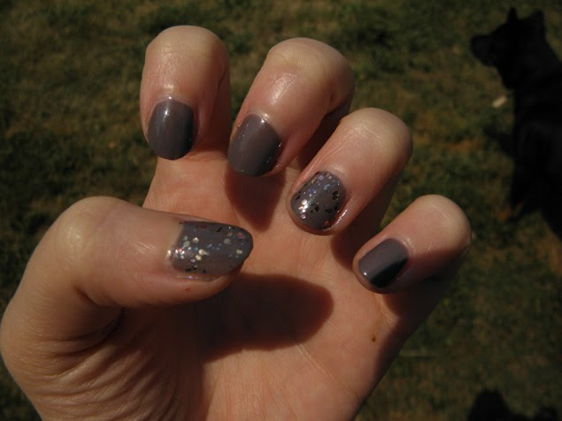 Today's "manicure" (I have a physical revulsion that almost functions like a killswitch preventing me from using that word in reference to me playing with paint in the most kindergarten way imaginable) is a nice, subtle taupe creme from Wet 'n' Wild, and because I can't leave well enough alone, I also spat some glitter on top of it.